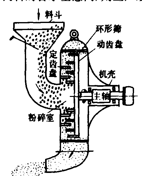 图2爪式粉碎机 爪式粉碎机 其结构如图2。由机壳、盛料斗、粉碎室和环形筛等组成。粉碎室由动齿盘和定齿盘组成。动齿盘上有3~4圈齿爪,定齿盘上有2~3圈齿爪,各圈齿爪交错排列。工作时,饲料原料由盛料斗通过进料控制闸板自动流入粉碎室的中央,受离心力和气流的作用,自内圈向外圈运动,在运动过程中,饲料受到动齿和定齿的多次冲击、搓擦而逐渐碎成细粉。同时由高速旋转的动齿盘形成的风压使细粉穿过环形筛孔排出,较大的颗粒仍留在筛圈内继续被粉碎,直到穿过筛孔为止。所配环形筛的孔径为0.5~3.5毫米,可根据饲料所要求的细度来加以选用。动齿盘外缘的旋转线速度为80~85米/秒。粉碎玉米的生产能力为45~55千克/千瓦小时。爪式粉碎机的特点是结构紧凑,粉碎粒度较细,适合于粉碎含纤维较少的精料。但耗能较多,齿爪易损坏和磨损,工作时的噪音较大。中国的爪式粉碎机已实现系列化,共有五种型号。 饲料粉碎机将饲料粉碎成细小颗粒的加工机械。常用的有锤片式、爪式和辊式3种。锤片式约占粉碎机总量的90%以上。锤式粉碎机要求饲料含水量不超过50%。农村用粉碎机线速度为60~80m/s。现有粉碎机噪声一般都超过85 dB。中国1998年拥有饲料粉碎机191.85万台。 |