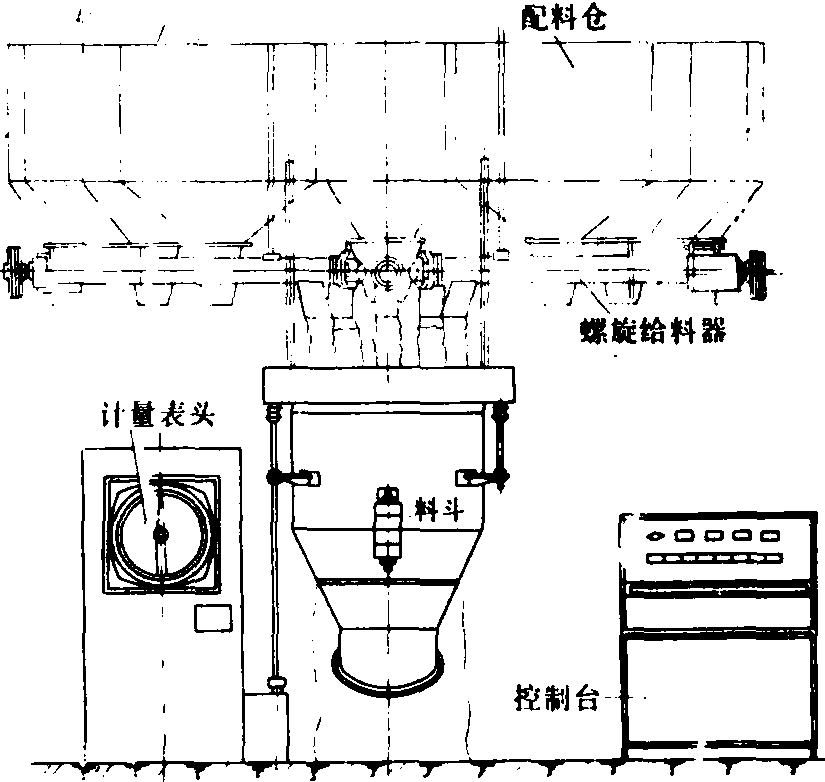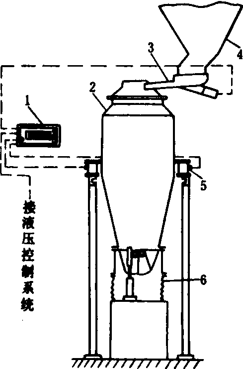 图3 电子秤示意图 1.仪表; 2.料斗; 3.给料器; 4.配料仓; 5.电子称重; 6.活门 |