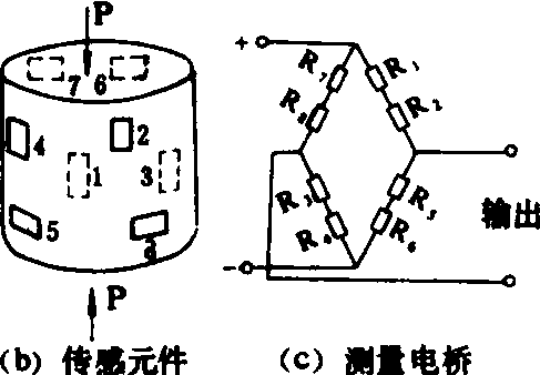 图2 字盘定值配料秤 电子式计量器 又称电子秤(图3),可以进行自动计量。它是利用电子称重传感元件来代替字盘秤。传感元件是一个金属弹性元件[图3(b)],在压力P的作用下产生弹性变形,在元件上贴有电阻丝片,各电阻丝片连成如图3(c)的测量电桥。当元件受压缩时,产生弹性压缩变形,使R1、R2、R3和R4电阻丝片缩短而电阻值降低,R5、R6、R7和R8伸长而电阻值增加,使电桥失去平衡而在输出端形成一微电压。工作时,给料器将料仓内饲料加入料斗,当料斗充满到调节好的分量时,称重元件的电桥中不平衡的微电压达到一定数值,通过仪表中的电接点输出信号,使给料器停止给料,并使料斗底门打开卸料。电子秤也可以进行多种配料的自动连续计量,也可预先编好程序由微型计算机来控制。计量精度可达0.2~1%。 微量元素配料秤用来按配方要求称量出各种稀释后的微量元素。它属于电子式计量器,但比用于配合饲料的电子秤容量小、精度高,常由微机控制。秤的顶部有12~20个用不锈钢制成的小料箱,每箱容积为0.13米3。箱底各装有一个由液压马达驱动的螺旋给料器,能根据配料量的大小自动调节转速。秤斗位于底侧,利用电子元件称量。最大称量值为100千克,最小为500克,其精度为0.01%。