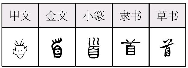 甲骨文象人头形。侧视,有发(髪),一目,有一耳,有口。西周金文简化,无口、耳。《说文》所载战国文字有发(髪),头已不大象,一目变两横,就是頁(页的繁体字)字的上半(去掉下儿(人)字)。小篆不带头发。隶楷的头发变成一点一小撇,下面一横,再下面成楷书自字,有的隶书成目字。看不大出是人头。义是头,脑袋。如:昂首|首饰。组词如:首领。引申指领导的人,带头的。如:首长。又指第一,最高的。如:首要|首席代表。又指最先,最早。如:首次|首创。又引申为出头告发。如:自首|出首。转为量词,指诗歌。如:一首诗。