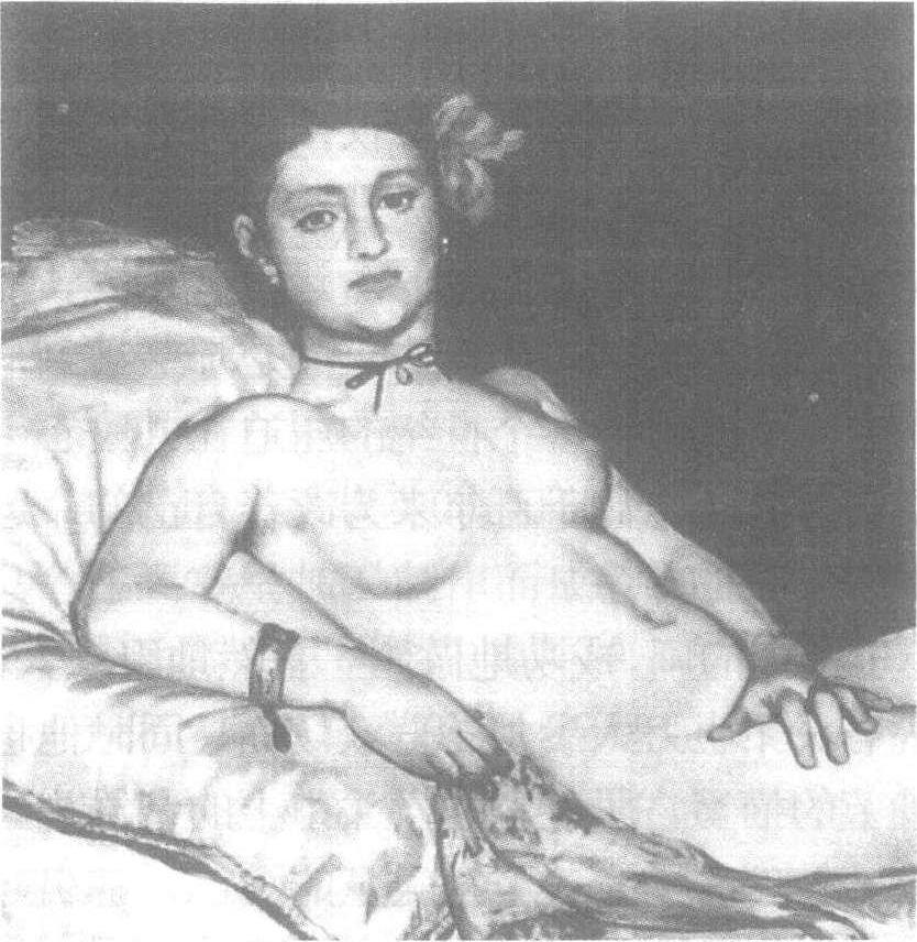 | 释义 | 马奈《奥林匹亚》 马奈《奥林匹亚》一位娇小的女人,雪白一身,斜躺在舒适的软床上,带花的披巾滑落一旁。她星眼流眸,直盯着我们。细看她,头上扎着桃红的蝴蝶结,胳膊上戴着配有坠子的金手镯,脚上穿着 一双高跟银边拖鞋。此时一位黑人女佣给她送来一束也许是崇拜者的鲜花,床边还有一只猫儿在伸着懒腰。
