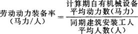 | 释义 | 劳动动力装备率 又称动力装备系数。 指施工企业自有机械的平均动力与建筑安装工人平均人数的比值。它是反映建筑业机械装备程度的指标。 其计算公式为: