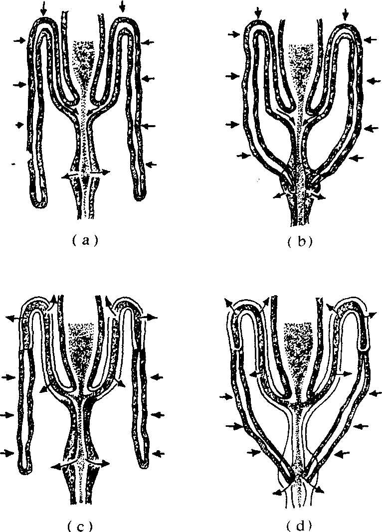 (仿Wigglesworth) 鞘翅目和鳞翅目昆虫马氏管末端贴附于直肠,形成“隐肾”结构。如黄粉甲(图3)马氏管端段以盘旋形、辐射状排列,围绕于直肠外面,马氏管与直肠间有一个空间——围直肠腔相隔。直肠腔、围直肠腔和马氏管腔之间具有复杂的内在联系。近血淋巴一侧的 “隐肾” 中马氏管外壁有很多分散的泡形突起,壁薄,称薄膈,能将血淋巴中的钾离子移入管腔。血淋巴中的水受围肾膜和薄膈的阻挡不能进入马氏管,管液渗透压明显高于血淋巴和围直肠腔液。围直肠腔的水从前端的低渗透压处流向后端的高渗透压处时,能不断渗入马氏管腔。围直肠腔内的渗透压高于直肠腔,使直肠腔内的水能流进围直肠腔中,即水流方向总是从直肠腔进入围直肠腔和马氏管腔,最后从隐肾部分的马氏管流进游离于血腔中的马氏管部分,大部分水随马氏管多余的钾离子回收到血淋巴中,故“隐肾”是充分回收水分的特效系统。鳞翅目幼虫“隐肾”系统中无薄膈,不能回收水分。 功能 马氏管的排泄机制,以吸血椿示例。马氏管端段部分将氮素废物以尿酸盐水溶液 (如尿酸钾或尿酸钠) 形成由体腔渗透进入马氏管,渐向基段移动。在此过程中,管内的二氧化碳与尿酸盐中的钾、钠化合成碳酸氢钾或碳酸氢钠及尿酸。当马氏管液移到基段时,基段内缘的刷状边细丝延长,有的甚至充满管腔并随着管液的流动而微微波动。溶于水中的碳酸氢钾随水分被基段管壁细胞收回血淋巴中,不溶于水的尿酸沉淀排入后肠。马氏管液的形成并非全靠浓度梯度的压力,如钾、钠离子的流向是逆电化梯度的。马氏管管壁细胞在管腔一侧的顶膜上有钾离子泵,对钾离子有高度亲和力,钾、钠离子都能穿过顶膜进入马氏管腔,水随之透过顶膜进入管腔,管壁细胞趋于皱缩,使血淋巴中的水和小分子物质透过基膜进入细胞。随着钾、钠离子主动运转到管腔中,管腔液比血淋巴的钾、钠离子的浓度高,其他几种离子如钙、镁离子等靠细胞中的浓度梯度从血淋巴中运转入马氏管。一般认为,离子的主动运转是管液流动的动力,在管液形成中具有决定意义,而马氏管的分泌则受到利尿激素的控制。