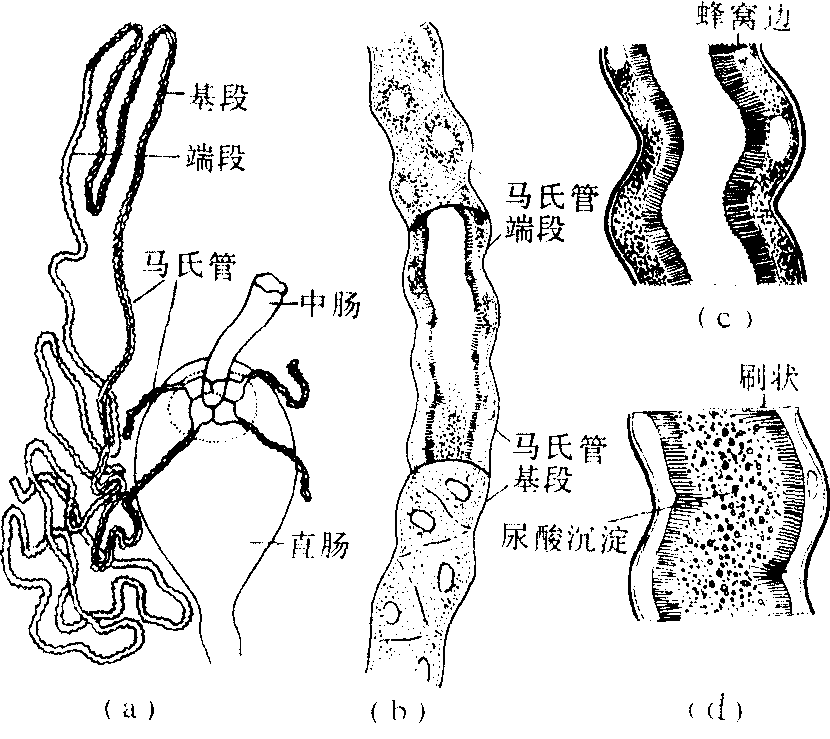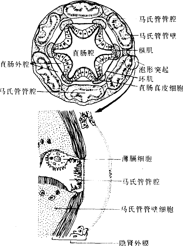 图 3 黄粉甲幼虫马氏管与直肠的隐肾构造 (仿Maddrell) 马氏管Malpighian tube昆虫的主要泌尿器官。因系意大利解剖学家马尔皮基(M.Malpighi)所发现而得名。呈细长盲管状,数目因种类而异。基段开口于中、后肠交界处,端段游离在血腔内或插入直肠的围膜内。一般由外向内有围膜、管壁细胞和内膜组成。围膜通透性较强。管壁细胞的基膜形成发达的内褶,顶膜形成微绒毛,内含丰富的线粒体,通过离子泵将原尿泵入管腔。有些种类的马氏管基段能从原尿中回吸水分和无机离子,使尿盐呈结晶状态析出,排入直肠。部分种类还具有管壁肌,能使马氏管进行自主性蠕动。 马氏管 马氏管mashiguan马尔比基氏管(Malpighiantube)的简称。指节肢动物如昆虫、蜘蛛、蜈蚣等的排泄器官。这种排泄器官是位于血腔中的丝状盲管,开口于中肠和后肠之间,有1对(如蜈蚣等)或多至一二百条。功能与环节动物的肾管相似,因由意大利解剖学家马尔比基(M.Malpighi,1628—1694)首先发现而得名。 ☚ 围心窦 盲囊 ☛ |