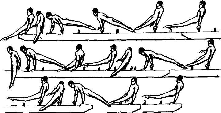 马端侧撑全旋隔两环前移同时转体90°至另一马端后撑 马端侧撑全旋隔两环前移同时转体90°至另一马端后撑该动作在鞍马项目中属高难度动作。中国运动员国林显在1987年2月26日国家体操集训队难新动作测验中完成了该动作。 由马端侧撑全旋开始,双手撑马端(接近鞍环),出腿时身体重心向前移,右手越两环撑另一马端,经双手前后撑两个马端(隔两环)的俯撑,进腿时身体重心移至右臂,以右臂为轴向右转90°,左手撑另一马端,至另一马端后撑。 该动作移位距离较大,要求运动员能很好地移动和控制身体重心,出腿时右手要尽快撑另一马端,同时身体重心要移至右臂,才能保证转体90°和整个身体直接移至另一马端。 初学时可在无环鞍马上练习纵向前移,以练习身体重心的移动和增大全旋的幅度。手移动的距离逐步加大,至达到越过两环的距离时,在鞍环位置增设障碍物(如海绵块),经过一段训练,运动员身体任何部位均不触碰障碍时,可到鞍马上进行练习。