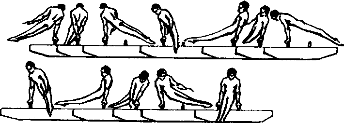 由同侧马端全旋开始,进腿时身体重心向右移,左手撑同侧环,经双手正撑同侧环的后撑,出腿时沿身体纵轴向左转体90°,右手撑同侧环,经侧撑同侧环的俯撑;进腿时左手撑同侧环,经侧撑同侧环的后撑,出腿时右手撑同侧环并同时沿身体纵轴向左转体90°,进腿时左手撑同侧环,至环上后撑部位。