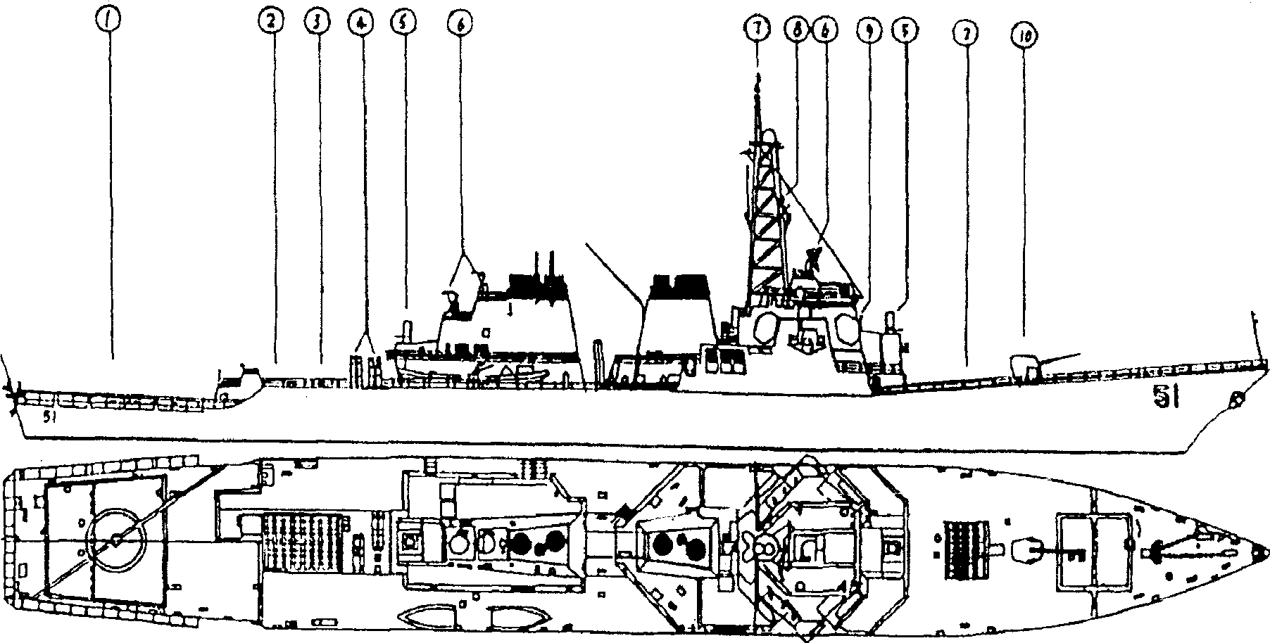“伯克”级外形及舱面布置图 ❶直升机平台; ❷MK41垂直发射系统; ❸三联MK32鱼雷发射管; ❹2座四联“鱼叉”舰对舰导弹; ❺MK15六管20mm小口径炮近程武器系统; ❻SPG-62“标准”对空弹制导雷达; ❼URN-25“泰康”空中战术导航雷达; ❽SPS-67 (V)对海警戒雷达; ❾SPY-1D相控阵雷达; ❿MK45型127mm炮 ☚ 战略导弹潜艇 护卫舰 ☛ 驱逐舰destroyer |