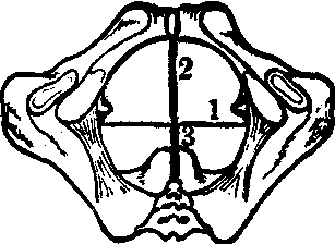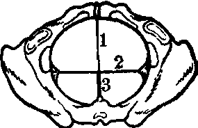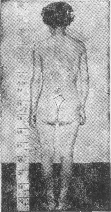 图2 歪斜变形米氏区 (3) 骨盆外测量,按下述顺序进行: ❶测量骶耻外径:孕妇取左侧卧位。左腿屈曲,右腿伸直,前据点在耻骨联合上缘下1cm,后据点为米氏区顶点,间距为20.5±1.02cm。此径线可间接估计骨盆入口前后径的大小,菱形的上角相当于第五腰椎棘突所在处,两侧角相当于髂后上棘。下角为两侧臀肌交叉点。第五腰椎棘突约在两髂后上棘连线中点以上2~2.5cm处,亦约在两髂嵴连线中点下1.5cm处。如果菱形不明显时也可按髂嵴连线找第五腰椎棘突所在处(图3)。 ❷测量髂棘间径:孕妇仰卧,据点为两髂前上棘外缘,间距为25.2±1.41cm。此径间接估计入口横径尺度(图4)。 ❸测量髂嵴间径:髂嵴为一弓形结构,无明确据点。测量时将测量尺的两端沿两嵴外缘循行至两嵴间最大距离,即为髂嵴间径,此径亦用作估计入口横径尺度。间距为28.4±1.11cm(图5)。上述测量结束后,孕妇两腿略为弯曲,检查者面向阴部,行以下检查。 ❹骨盆前部高度: 为估计骨盆深浅的指标,上据点为耻骨横支上线,下据点为坐骨结节正中区,间距为9.3±0.75cm。 ❺耻骨联合高度:亦为估计骨盆深浅的指标,上据点为耻骨联合上缘,下据点为其下端。间距为5.6±0.48cm。 ❻耻骨弓检查: 两拇指沿耻骨支向下滑行,了解耻骨坐骨支曲度,可估计耻骨弓为女型或男型,其顶端角度为84.20±7.35°。 ❼出口横径: 两坐骨结节间距,孕妇仰卧。两手紧抱双膝,使髋关节及膝关节全屈,以使坐骨结节突出,测量坐骨结节前据点内侧缘的距离,临床测量值为9.0±0.75cm。此径线系骨盆出口的横径,一般所用测量为汤姆斯(Thoms)及狄利(Delee)测量器, ❽ 出口前后径: 系耻骨联合下缘至骶尾关节外表面的间距,为12.3±1.17cm。 ❾出口后矢状径:系出口横径的中央点至骶尾关节外表面间距,为9.3±0.8cm, ❿可用出口前后径:为了实用,可用柯氏骨盆出口测量器,直接测得可用出口前后径,此数值若超过10.0cm,俯屈良好的胎头可通过出口,如胎头取枕后位娩出时,此径线需长达12.0cm。柯氏骨盆出口测量器是综合分娩动态及骨盆出口的特殊形态而设计。其主体为—9.5cm直径的半圆板,代表正常胎头的双顶间径,半圆板的右侧附一把柄,使用时以左手持此半圆板置于耻骨弓区域,以表示胎头通过耻骨弓区域的实态。半圆板上数条径线,用以测量出口横径。半圆板顶端附一弯尺,使用者用右手将此弯尺的尾端,置于骶尾关节外表面,即能测得可用出口前后径的数值。