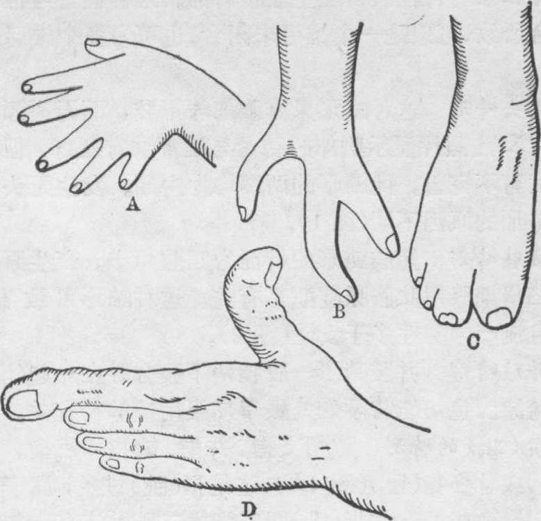 图3 并肢畸形 指(趾)的畸形 包括支指、并指、缺指和巨指。支指(趾)或称多指(趾)(图4A),这是指(趾)过多,属于遗传性因素致成的。并指(趾)即二指或二趾并连在一起的畸形(图4C),这种畸形也是属于遗传性的。缺指(趾)或龙虾爪手(图4,B),是缺少指(趾)的现象,出现率比多指(趾)为少。巨指是手指异常增大的畸形,常发生手拇指及食指(图4D)。发生巨指的原因可能是内分泌功能受到干扰,或许与遗传因素有关。(本条图1~4见下页)