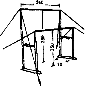 高低杠 高低杠教学和训练用的一种女子体操器械。标准高低杠是由固定在不同高度支柱上的两根横杠组成。横杠长240厘米,高杠高230厘米,低杠高150厘米,两杠立柱间安装有调整器,可以调整两杠间的宽度。有8条尼龙钢丝绳拉链,链上有调整松紧的装置,为了拴锁尼龙绳和保证杠面安装牢固,在横杠两端安有厚为0.2厘米、长为10厘米的钢管,横杠是由弹性木质或玻璃钢制成,以保证完成各种高难动作。