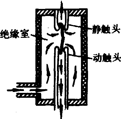 开关电器灭弧装置 用于熄灭因开关断开电流时形成电极电子发射、碰撞游离和热游离所产生的电弧。主要有以下装置: 油吹动灭弧装置 利用电弧本身的热量,使绝缘油分解,产生高压的油、气流,吹动电弧使之熄灭的装置。有:❶油纵吹灭弧室,灭弧过程如图2所示; ❷油横吹灭弧室,灭弧过程如图3所示; ❷油环吹灭弧室,灭弧过程如图4所示。管状的动触头侧面有孔,端部镶有绝缘,当它向下运动时产生电弧;绝缘端头将环形喷口中间圆孔堵塞并把高压气泡分隔成两部分,下部气泡使油流喷向环形喷口;向下移动的动触头又迫使油箱中的油经动触头内腔、侧面小孔喷向电弧区,加强灭弧效果。