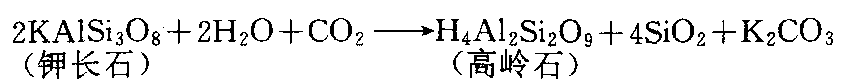原生硅酸盐矿物在自然界温度、水、二氧化碳的综合作用下,生成高岭石类黏土矿物的过程。如钾长石的高岭石化作用: