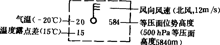 ![]() 高空等压面图气象要素填写型式 高空天气图upperair chart填绘高空观测资料的天气图。它是将各气象台、站同一时间的高空气象观测资料用数字和符号形式,填在空白地图上,并绘出各种曲线,以了解各地高空气象情况。现在常用的是等压面天气图,是把各地同一时刻探测到的同一气压层上的气象资料填写在空白地图上,经分析绘制而成。这些资料包括等压面位势高度、气温、温度露点差、风向、风速。通常绘制等(位势)高度线和等温线,用以分析气旋、反气旋、锋区、切变线、急流等天气系统的位置、强度和特性。一般气象台以850 hPa、700hPa、500 hPa等压面图为最常用. 各层等压面图与地面天气图配合,可分析空间的结构。世界共同规定的高空天气图一天有二次,即00和12世界时,亦即08和20北京时。