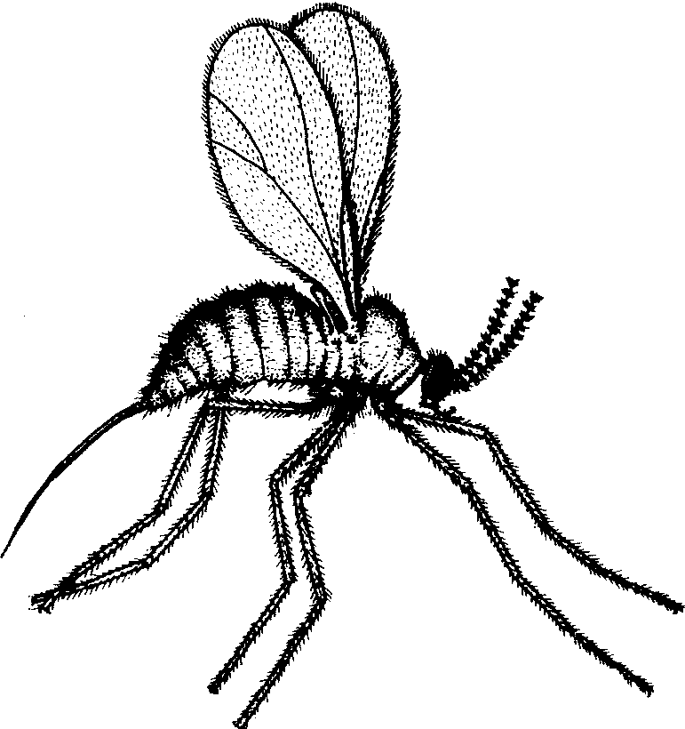高粱瘿蚊(雌) 在美国得克萨斯州以滞育幼虫在寄主植物的小穗颖壳内作一薄茧越冬。越冬幼虫大部分在春暖时开始化蛹。但化蛹期很不整齐,部分幼虫可以连续滞育2~3年。当4月中旬野生假高粱和其他野生寄主植物开花时,首批羽化的成虫即在其上产卵,繁殖第一个世代。当栽培的高粱进入盛花期,越冬代幼虫大量羽化为成虫,此时在假高粱上繁殖的第一代成虫也在羽化,因此有大批成虫飞集到开花的高粱上产卵繁殖。成虫羽化后即可交配。雌虫产卵于高粱小穗的颖壳内。成虫寿命约一天。卵期2~4天。幼虫期9~11天。蛹期2~6天。完成一代约需14~16天。每年约发生13代。各代幼虫都有部分滞育,解除滞育需得到一定的雨水。年降水量在400毫米以下时,不利于发生; 但年降水量过大,对发生有抑制作用。在苏丹,成虫出现始于9月下旬,直至12月末,在田间都可找到高粱瘿蚊的各虫态。12月底至1月初,大部分幼虫作茧休眠,至下一个生产季节才恢复活动。 可利用天敌防治。高粱瘿蚊寄生蜂有啮小蜂(Te-trastichus sp.)及Aprostocetus diplosidis和Eupelmus popa等。捕食性天敌有火蚁等;选用抗虫品种和花期一致的良种,适当提早播种,加强田间管理、清除野生高粱可减轻为害; 药剂防治可在高粱抽穗露头时喷洒甲基对硫磷、甲萘威等,对有滞育幼虫的种子可用溴甲烷熏蒸处理; 严格检疫,高粱瘿蚊是以幼虫在寄主植物种子内休眠,可随寄主植物种子的运输而传播。对于尚未脱粒的成束的穗头,带虫的可能性更大,应禁止自疫区输入。对发生地区输出的寄主植物种子应进行严格的检疫。 高粱瘿蚊sorghum midgeContarinia sorghicola Co-quillet,昆虫纲,双翅目,瘿蚊科。中国对外植物检疫对象。分布于印度、巴基斯坦、苏丹、乌干达、肯尼亚、意大利(西西里岛)、塞浦路斯、墨西哥、美国。在美国为害高粱严重。寄主还有甜高粱、帚黍。成虫体长约1.5 mm,胸部橘红色,中胸背板中央和穿过侧板并在腹板扩大的一个斑点为黑色,腹部橘红色,翅灰色透明,雌虫产卵器长,针状。幼虫体长约2 mm,深红色,圆筒状,两端微尖。以幼虫休眠体在寄主小穗内越冬。产卵于发育种子的外颖内壁。幼虫吸食发育中种子的汁液,使之变成秕粒。幼虫在小穗内化蛹。宜加强检疫措施,防止传入。在发生地区消灭带越冬幼虫的残株,及野生寄主如约翰生草、苏丹草可减轻危害。