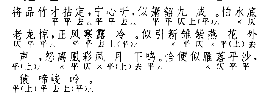 鬼三台 鬼三台无名氏 《赤壁赋》  全曲九句:3 △,3 △,4 △。5 △,4 △。7 △,7 △。4,4 △。第四句有不叶韵者,如武汉臣《老生儿》、杨梓《豫让吞炭》。末句有叶去声韵者,如王实甫《西厢记》“夜去明来”折、费唐臣《贬黄州》第二支、旧题关汉卿作《绯衣梦》,不宜从。无名氏《赚蒯通》减第八句,仅见。《西厢记》“夜去明来”折第六、七句:“道老夫人事已休,将恩变为仇,着小生半途喜变做忧。”第六句本七字,似破为两个五字句,且增一韵;实则减去衬字,即仍为七字句。这两句曲文是:“夫人事休恩变仇,小生半途喜变忧。”第六、七句宜作对语。杨景贤《西游记》第十二出〔鬼三台〕为〔秃厮儿〕之误题(下 一曲牌〔秃厮儿〕为〔圣药王〕之误题);第 二十三出〔鬼三台〕为〔圣药王〕之误题。一名〔三台印〕。常被误题为〔耍三台〕,如贾仲明《升仙梦》,无名氏《单鞭夺槊》、《鸳鸯被》、《赤壁赋》。 ☚ 东原乐 耍三台 ☛ 00007497 |