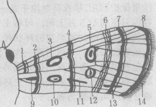 成虫 蝶类与蛾类的主要区别表现在:蝶类触角棍棒状,体色大都鲜艳,多白天活动,静止时翅直立背上,翅连锁属翅抱型,蛹为垂蛹或带蛹。蛾类触角羽状、栉状、齿状或丝状,体色暗,常在夜晚活动,翅连锁多属翅缰型,少数为翅轭型或翅抱型。蛹在地下、茎梢中或茧中,为被蛹。 本目共同特征为:成虫翅、身体和附肢上布满鳞片。头部多呈圆球形,有一对发达的复眼和两个单眼。虹吸式口器,下颚特化成喙,上颚在绝大多数种类中均消失。下唇须发达,分为3节,其大小及形状往往是性别和种类识别的依据。胸部一般有两对膜质翅,前翅多比后翅大。翅的形状(图1)在各科中常有变异,可用以辨别类群。脉序的特点为: 前、后翅中脉(M)主干消失形成一中室。前翅脉序为亚前缘脉(Sc)1支、径脉(R)5支、中脉(M)3支、肘脉(Cu)2支、臀脉(A)3支,1A常退化,2A和3A共柄或合并,共12支。由于后翅脉序的变异而分为同脉亚目和异脉亚目。前者前、后翅脉序相同; 后者后翅只有8支翅脉或更少,其中径脉的R1和Sc脉合并,Rs脉单一。同脉亚目前、后翅间的连锁器为翅轭型,包括少数比较原始的蛾类。异脉亚目中绝大多数蛾类为翅缰型,蝶类和枯叶蛾、天蚕蛾等则为翅抱型。前翅花纹多变,也是识别种类的重要依据,现举夜蛾前翅模式(图2)供参考。