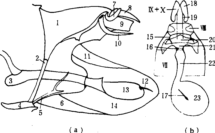 前胸较退化,呈颈状,两侧有小突起,称为领片。中胸两侧前方有三角形翅基片。足分5节,胫节距一般为0-2-4,少数为0-2-2,也有无距的。蛾类在后胸节或腹基的两侧有鼓膜听器,尺蛾中特别明显。 腹部10节。第一节退化,腹板或仅成膜状。第七、八两节,因生殖器关系,稍有变化。第九、十两节变化更大。在原始蛾类中雌蛾只在腹部第十节有一生殖孔,被称为单孔类;但在绝大多数种类中第八节还生有一交配孔,被称为双孔类。外生殖器(图3)结构比较复杂,不同种间区别明显,同种个体间变异小,常为鉴别种类的重要依据。雄蛾(图3a)第九腹节背板(背兜tegumen)和腹板(基腹弧vinculum)形成一个环;腹板的中部向体内延伸成一个囊状构造,叫囊形突(saccus);附肢形成一对抱器(harpagone);第十腹节背板的后端形成一个略向下弯曲的爪形突(uncus),下面有一对颚形突(gnathos),通常左右合并成一个。肛门位于爪形突与颚形突之间。阳茎位于背兜和基腹弧之间的隔膜上,阳茎中常具有阳茎针(cornutus)。雌蛾(图3b)无特化的产卵器,腹部末端数节细长、套叠,可伸缩。产卵孔两侧有一对产卵瓣,用以握持产出的卵,胶着于物体上。交配孔内有一交配囊,囊上有骨化的囊突(signum)。囊突的数目和形状,也是鉴别种类的依据。