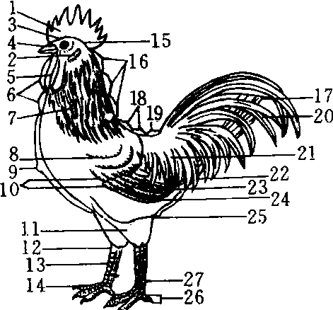 鸡体部位名称 1.冠 2.耳 3.前额 4.喙 5.髯 6.喉头与颈 7.颈羽 8.肩羽 9.胸 10.覆翼羽 11.胫骨 12. 飞节 13.蹠骨 14.趾 15.后脑 16.颈 17.主尾羽(舵羽) 18.背 19.腰部 20.瑶羽 21.簑羽 22.覆尾羽 23.副翼羽 24.主翼羽 25.腹 26. 第一趾 27.距 鸡四川主要家禽,畜牧业的重要组成部分,城乡居民禽蛋消费的主要来源。在全国同行业中占有重要地位。有地方品种和引进品种两大类。地方品种有黑色鸡种、黄色鸡种和杂色鸡种三类。黑色鸡种的代表型是旧院黑鸡和峨眉黑鸡 ,多分布在海拔2000米左右的山区; 黄色鸡种的代表型是彭州黄鸡,主要分布在盆地内部的平原及广大丘陵地区; 杂色鸡种的代表是藏鸡和米易鸡,分别分布在川西北高原和川西南横断山区。地方品种肉质优良,主要在农村饲养,是四川养鸡业的主体。引进品种分蛋用型和肉用型两类。蛋用型品种有伊莎、罗曼和海兰等,肉用型品种有爱拔益加、艾维茵等。引进品种主要在经济条件较好的城市和工矿区周围专业户和集约化鸡场饲养。成都、内江、重庆、乐山、绵阳、德阳等地养鸡最多。全省年出栏200万只以上的大县有19个。1994年全省存栏16248万只,占全国的4.9%,位居全国第七; 出栏20732万只,占全国的5.1%,位居全国第五;禽蛋产量 (含鸭、鹅蛋) 73万吨,占全国的5.0%,位居全国第七; 鸡肉产量30万吨。 鸡鸟纲鸡形目雉科原鸡属动物。公元前3000~前2000年开始驯化。全球有鸡的品种约100个,变种300多个,具有较高经济价值的品种10余个。按体型分为普通型和矮小型2类。肉用鸡生长需8~9周,蛋鸡约需22周才能产蛋,蛋重50~65 g。产蛋量第1年最高,孵化期21d。鸡蛋蛋白质含量12.3%,鸡肉蛋白质含量21%。 鸡 鸡jiGallus domestica脊椎动物,鸟纲,雉科的一类家禽。嘴较短锐,具有肉冠和肉垂,翼一般不发达,但脚健壮。公鸡啼声宏亮,喜斗,羽毛美艳,跖部有距。母鸡性情驯良,早熟,一般5~8月龄即可开始产蛋,年产近百个至二三百个不等。蛋壳褐色、浅褐色或白色。产蛋量逐年递减。孵化期约21天。鸡的寿命较长,约20年。优良品种较多。可分蛋用型,如原产意大利的来航鸡,年产蛋200个以上;蛋肉兼用型,如原产我国的九斤黄、狼山鸡等;近年各地又培养出多个肉用型新品种。此外,产于日本的长尾鸡,是著名的观赏型鸡,体虽小,但尾羽可长达11米。我国特产乌鸡可供药用,除制有闻名中外的妇科药品“乌鸡白凤丸”外,近年又制成“中华乌鸡精”口服液,具有调节机体和补充营养功能。 ☚ 原鸡 来航鸡 ☛ 鸡 鸡ji人们饲养很普遍的一种家禽,有肉用型、卵用型及肉卵两用型。鸡的头顶有肉冠,嘴较短而尖锐,下有一对肉垂;眼睛在头部两侧,有眼睑;由于眼球内缺乏感受弱光刺激的神经细胞,夜晚没有视觉能力;耳下面有椭圆形耳垂。鸡前肢成翼,但短而不发达,因此不能久飞,也飞不高;鸡的一对后肢很健壮,善走,适应陆地生活。鸡啄食小昆虫及谷物种子等。鸡羽毛颜色鲜艳而有光泽,尾羽亮丽、较长(在云南等地有人工培养的尾羽数米长的长尾鸡)。公鸡足上部内侧有一角质突起,叫距,公鸡好斗,清晨啼鸣。母鸡羽毛颜色较单调,鸡冠较小,不善啼,产卵,并能孵卵。鸡卵重约40~70克,母鸡种类不一样,产卵数量及重量、颜色等也不同,一般年产卵数10~200多枚不等,最好的来航鸡有达到年产365枚的。我国养鸡事业发展很快,鸡的品种和数量都很多,著名的有“寿光鸡”、“来航鸡”、“狼山鸡”等等,现在主要是在鸡场中科学饲养。 ☚ 家禽 鱼 ☛ 鸡 鸡Ji鸡形目鸟类的统称。大多数种类雌雄异型异色,雄鸟体型大而羽色华丽,雌鸟体小而羽色暗淡。嘴短而强健,上嘴微曲,稍长于下嘴。鼻孔椭圆而不被羽。两翅短圆,具有10枚初级飞羽。尾羽大多发达,由12—20枚尾羽构成。脚强健,具四趾,适于在地面上奔走,雄鸟的跗蹠部常具有1—3个距。大多数陆栖,少数树栖。飞行能力较差,善于在地面上奔走。多以果实、种子及植物的根茎或叶片为食,也取食一定数量的昆虫及其它小型动物。巢多筑在地面上,每窝产卵的数目随种类而有很大变化,多在2枚至10枚之间。孵化期约28天。共有276种,我国有59种,占世界鸡类总数的五分之一以上,因此我国素有“鸡类王国”的美称。有19种分布仅局限在我国境内,是我国的特产动物,如褐马鸡、红腹锦鸡、黄腹角雉、绿尾虹雉、白冠长尾雉、四川山鹧鸪等。分布最广、数量最多的一种野鸡是环颈雉(Phasianus colchicus),除了西藏的局部地区和海南岛以外,其踪迹遍及全国各地,是我国著名的狩猎鸟类,并已被陆续引种到欧洲、北美和大洋洲的许多国家。 ☚ 鸿雁 鸭 ☛ 鸡 鸡Gallus domestica脊椎动物,鸟纲,雉科家禽之一。嘴短而尖锐,上嘴大并弯曲。头上具有肉冠。嘴下有肉垂。翼一般不发达,不能高飞,但脚健壮。公鸡啼声宏亮,喜斗,羽毛艳丽,尾羽长而弯曲,跖部有距。母鸡性情驯良,早熟,一般5~8月龄即可开始产蛋,年产100多个,最多可达200~300个。蛋壳褐色、浅褐色或白色。产蛋量逐年递减。有孵蛋习性,孵化期约21天。雏鸡出壳后能独立生活,或由母鸡带领找食物吃。鸡的寿命较长,约20年。优良品种较多。可分蛋用型,如原产意大利的来航鸡,年产蛋200个以上;蛋肉兼用型,如九斤黄,狼山鸡、澳洲黑鸡等;肉用型,如浦东鸡。近年全国各地又培养出多个蛋用型和肉用型新品种。此外,产于日本的长尾鸡,是著名的观赏型鸡。体虽小,但尾羽可长达10.9米。我国特产的乌骨鸡