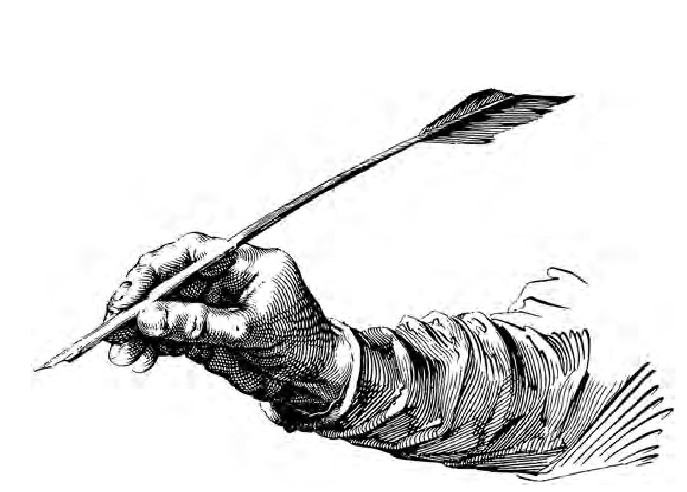持于手中的鹅毛笔 用来制笔的羽毛管内部的髓要清除干净,而且它的尖端要切成倾斜状。然后再在尖端的两面切上两刀就能制出形状合适的笔尖。如果需要的话,还可以通过切刀的方式对笔尖斜切面进行修正,以决定书写笔画的粗细。为了防止注入羽毛管内的墨水滴落,需要在羽毛管的尖端开一条小缝。 |