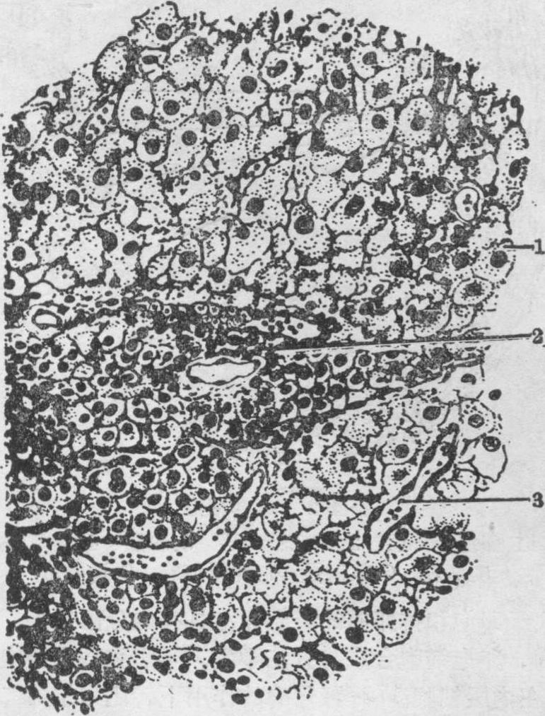 图1 黄体 1.粒黄体细胞 2.膜黄体细胞 3.血管