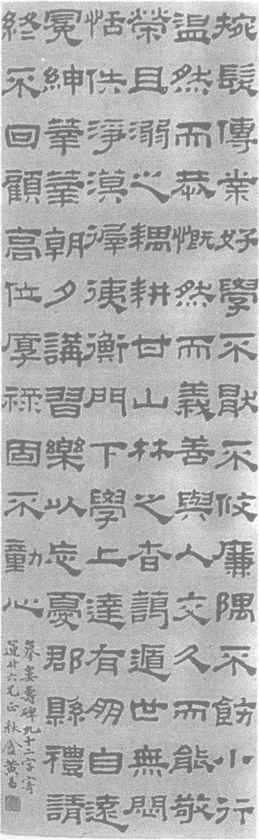 清。纸本。纵102厘米,横30厘米。北京故宫博物院藏。黄易(清乾隆九年—嘉庆七年,即公元1744—1802年),字大易,号小松,又号秋景庵主、散花滩人,浙江仁和(今杭州)人。幼承家学。官济宁同知。工诗文。善画山水墨梅。篆刻师事丁敬,兼及宋元诸家风格,为“西泠八家”之一。精通金石碑刻,并致力于访求摹拓和著录。分隶书笔意沉着,尤得古法。杨守敬云:“小松分书以小字模武梁祠画像之题字,尤为绝伦。”观此幅隶书,所摹《娄寿碑》九十二字,朴茂浑厚,脱尽唐人窠臼,深得汉隶三昧。