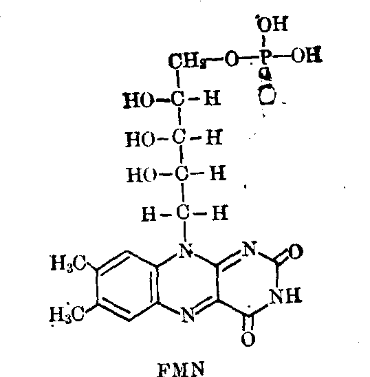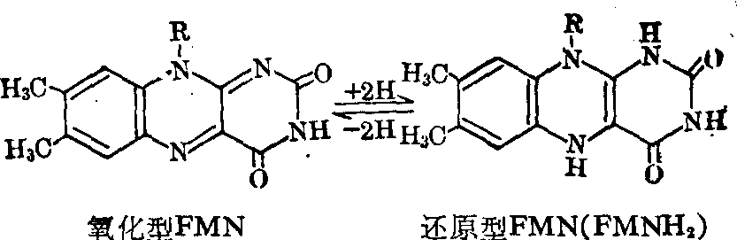核黄素磷酸酯。有氧化型和还原型两种形式,分别简写成FMN和FMNH2。含有维生素B2,是一种假核苷酸。在氧化还原反应中,分子中的异咯嗪环可以可逆地进行加氢和脱氢反应。为一些需氧或不需氧脱氢酶或黄素蛋白的辅基,在生物体内一般起递氢作用。