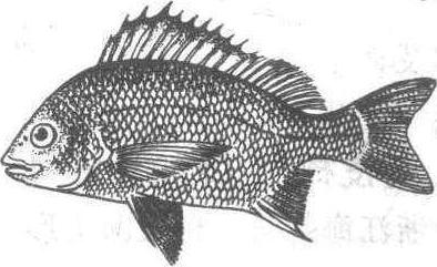 黄鳍鲷black breamSparus latus Houttuyn,硬骨鱼纲,鲈形目,鲷科。长约15~25 cm。体椭圆形,侧扁。头中大,前端尖。口前位,口裂水平状。上下颌前端具圆锥牙,两侧具臼齿。侧线具鳞44~46,侧线上鳞通常5枚。体具若干条黑色纵带,腹鳍及臀鳍下叶黄色。为暖温性浅海底层鱼类。喜栖息于岩礁海区。一般不作长距离洄游。杂食性,摄食贝类、长毛对虾、蟹类、藻类和有机碎屑。生殖期为12月至翌年1月,幼鱼有雌雄同体现象。分布于中国、朝鲜半岛、日本及印度洋北部沿岸。中国产于南海、台湾海峡。黄鳍鲷经济价值较高,肉质好,富含脂肪,可作为港养对象,春天在沿海港湾开闸纳苗,进行养殖。