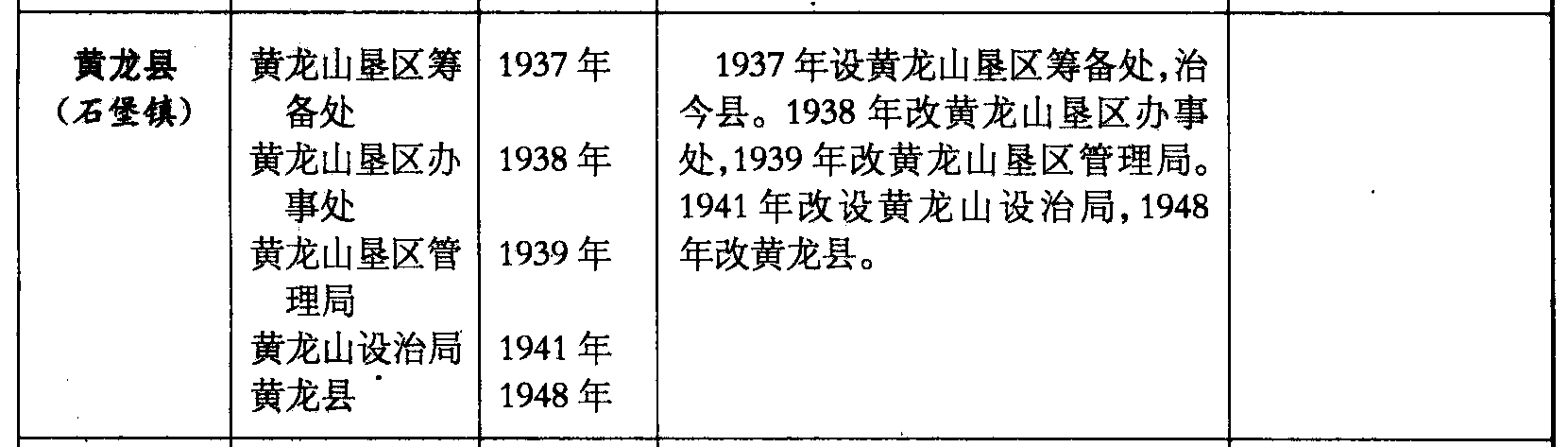 黄龙县(石堡镇)黄龙山垦区筹备处黄龙山垦区办事处黄龙山垦区管理局黄龙山设治局黄龙县1937年1938年1939年1941年1948年1937年设黄龙山垦区筹备处,治今县。1938年改黄龙山垦区办事处,1939年改黄龙山垦区管理局。1941年改设黄龙山设治局,1948年改黄龙县。