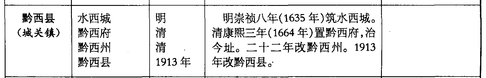 黔西县(城关镇)水西城黔西府黔西州黔西县明清清1913年明崇祯八年(1635年)筑水西城。清康熙三年(1664年)置黔西府,治今址。二十二年改黔西州。1913年改黔西县。