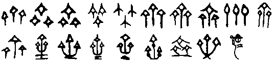 [小篆]《說文》: ,禾麥吐穗上平也。象形。凡齊之屬皆从齊。(七篇上)