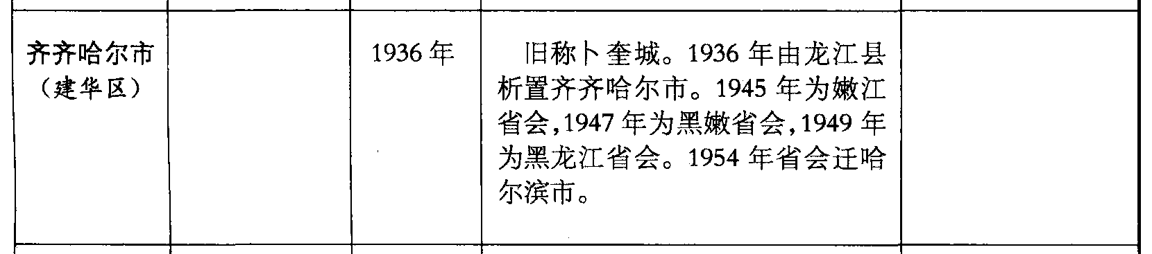 齐齐哈尔市(建华区)1936年旧称卜奎城。1936年由龙江县析置齐齐哈尔市。1945年为嫩江省会,1947年为黑嫩省会,1949年为黑龙江省会。1954年省会迁哈尔滨市。