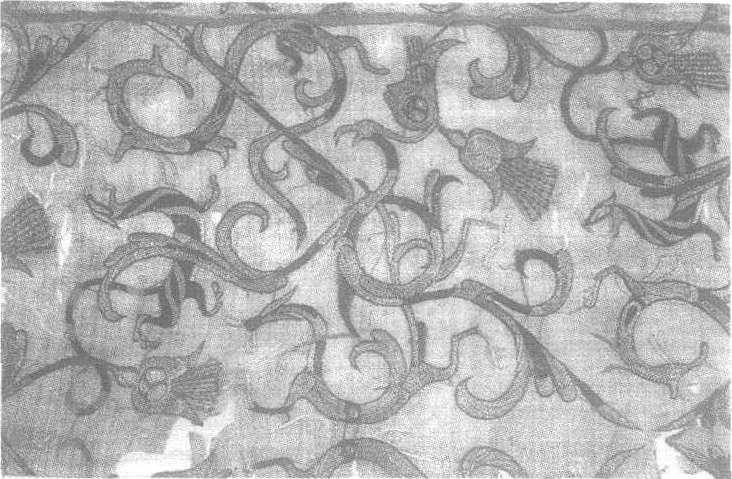 战国制品,1982年在湖北江陵马山一号楚墓中出土,在墓中用作灰白色罗单衣的衣面装饰,现为湖北省荆州地区博物馆收藏。花纹长29.5厘米,宽21厘米,用色有红棕、棕、黄绿、土黄、橘红、黑、灰多种,采用辫绣针法。每组图案有 一凤、二龙、一虎。凤戴花冠,足攫小龙,双翅奋击龙、虎,形象矫健生动。有专家认为,楚人的图腾是凤、巴人的图腾是虎、越人的图腾是龙,这种图案象征着楚人与巴人、吴人、越人的争战,表现的主题是楚人对胜利的自信和企盼。但从绣面上看,虎的色彩最为鲜丽醒目,形象也昂扬勇猛。