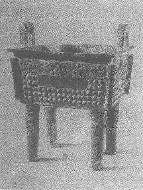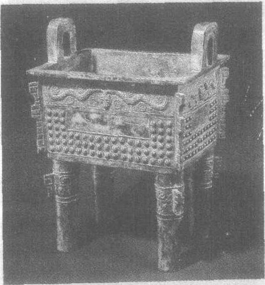西周。古代炊器,礼器。通高20厘米,口长16厘米,口宽13厘米,腹深7.8厘米。1956年河南省上蔡县田庄西周墓出土。河南博物馆藏。此鼎直口,口呈长方形,折唇,四壁近垂直,平底微凹,四个圆柱形足,鼎腹四隅起棱。口沿下各面有龙形纹两个,其下均有乳钉纹,排成凹字形。四足上部各铸有饕餮纹一个。器体和器足合铸而成。龙是传说中的神物,被用作装饰,施于礼器,这是自商代以来就有的习俗。但商代的龙多呈屈曲状,像这种一首二身和蟠龙的作法,却盛行于西周。