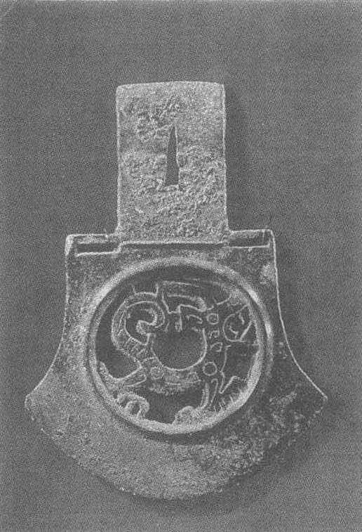 | 释义 | 龙纹铜钺 龙纹铜钺商。通长17厘米,圆穿径9厘米。1964年陕西省城固五廊庙出土。陕西省城固文化馆藏。钺,古代兵器。盛行于商、周,多为礼仪所用。此钺内长方形,中有三角形穿。本有二长穿。援透雕为龙形,作行走状。刃边呈圆形,两角向外侈。此器设计巧妙,制作精工,其风格特殊,尤内穿作狭三角形,与巴蜀兵器有一定关系。为商代青铜器中的一件艺术珍品。