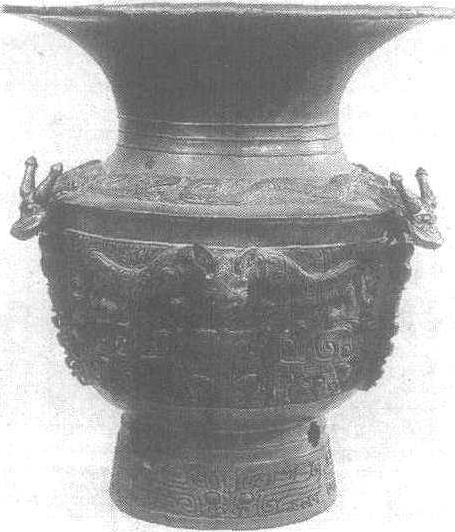 | 释义 | 龙虎铜尊 龙虎铜尊商。古代盛酒器。高50.5厘米,口径45厘米。重26.1公斤。1957年安徽省阜南县朱砦润河出土。北京中国历史博物馆藏。此尊大口,侈唇,折肩,腹下敛,高圈足。颈部饰三道弦纹。肩上饰三龙纹,龙躯隆起,首探出作下视状。腹部有三道扉棱,其间饰双身虎纹,虎首突出噬人。圈足上部有三个宽圆十字镂孔及两道弦纹,下饰饕餮纹一周。通体灰绿,光洁如玉。与此尊同出的铜器尚有尊一、斝一、鬲一、觚二、爵二、共计八件。此尊范铸之精工,保存之完好,在古代青铜器中殊不多见。它是用十四块外范,两块内范从圈足处注入铜液合铸而成。浇铸时使用了六个支钉,突出的龙首和虎首是采用二次浇注完成的。猛虎噬人纹在商周时期的铜器、玉器中屡有出现。《吕氏春秋·先识览》称:“周鼎著饕餮,有首无身,食人未咽,害及其身,以言报更也。”龙虎尊的纹饰证明了文献所载:“食人未咽”的图案,即是饕餮纹的本来面目。