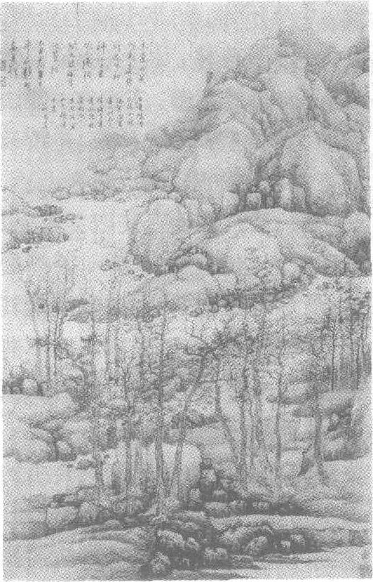 清。龚贤(见《龚贤夏山过雨图轴》条目)绘。纸本墨笔。纵99.7厘米,横65厘米。上海博物馆藏。作者在此件作品中一改苍茫浑郁的风格,用墨以简淡为主。画面上的山峦其势巍巍,雄伟高峻。低处的坡地崎岖坎坷,溪泉曲折于谷地,秋林枝桠曲劲,仅存稀疏的丹黄之叶。两间茅舍半掩于山石之后。作者以干墨层层皴点。墨色层次丰富,光线照射在山林间所形成的阴阳向背的效果,通过留白和皴擦给予得体的表现。近处树干的落笔雄健奔放,构图密而不乱,实中求虚。整个画面意境幽僻,秋意浓郁,令人感到清朗恬淡,并无凄凉哀婉的气氛,充分表现了作者热爱自然,融于自然,并以脱俗超世的心境去观察和表现景物季节变化的本愿。图左上方有自题七言诗一首。款署:“乙丑霜寒日,半亩龚贤画亦题。”乙丑为康熙二十四年(公元1685年)。此画堪称龚贤的杰出代表作。