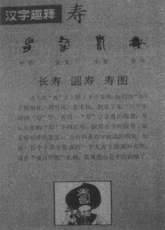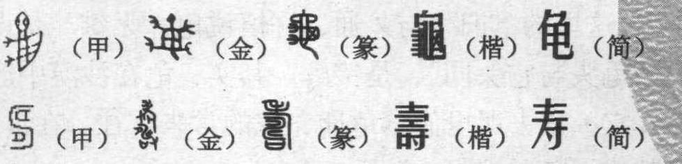 “龟”,从甲骨文一直到楷书,都是象形字。甲骨文的 “龟”,是龟的侧面全身图,突出的头部和两只眼睛,惟妙惟肖,坚硬的龟壳及其纹理与慢步行走的爪子都清楚可见,如果来个九十度倒时针旋转,活像与兔赛跑时的那一副神气。龟,殷墟卜辞用作动物名,“有来自南氏 (致)龟。” 是说南方国进贡来了龟甲。也用作动词如 “唯龟令(命) …” 说的是龟卜的结果。 金文的 “龟”,是龟的正面全身图,展示似的四条“腿脚” 系于圆圆的龟壳四周,一切都显得毫不含糊和有头有尾。 小篆的 “龟”,在象形造意的基础之上,增加形符“它” (即蛇),这是由于古人的错觉所造成。古人以为龟无雄性,它的繁衍是与蛇交媾的结果。小篆形体的“龟”,头显得特大,龟壳虽有纹理但又小得不成比例,龟爪和龟尾都清晰再现。楷书的 “龟”,是小篆形体的隶变。 简化后的 “龟” 简捷明快,“弯弯尾巴锥子头,身穿袈裟缓步行”,仍不失它那当年与兔子赛跑时的风度。 《说文》:“龟,旧也,外骨内肉者也。龟头与它(蛇)头同,天地之性,广腰无雄,龟鳖之类,以它(蛇)为雄。”这里的 “旧” 与久通,许慎说龟 “无雄” 是误解,说“龟头与它头同”,是错解。其实,龟在沙漠中产卵,蛇(它)常去那里偷食龟卵,蛇的常来常往,在世人眼里就成了龟的 “奸夫”。 龟是最易勾起人们怀古情愫的灵物。龟卜吉凶至少起于夏代以前。殷商时代 “习龟卜”已是奴隶主贵族的必修课。西周设龟人(官名),掌六龟之属。若有祭祀,则奉龟以往,军旅和丧事也不例外。画有龟象的旗帜称龟旐; 国家的重器称龟玉、龟鼎; 占卜的书简称龟经;占卜的吉凶兆纹称龟镜、龟鉴。《史记·龟策传》: “有神龟在江南嘉林中。嘉林者,兽无虎狼,鸟无鸱枭,草无毒螫,野火不及,斧斤不至,是为嘉林。” 龟城还是今成都的别称,据载:战国时秦张仪、司马错入主成都,屡筑城墙颓而不立,时有大龟出于江,周行旋走,随而筑之,城立遂因以为名。蜀太后徐氏有诗云: “周游灵境散幽情,千里江山暂得行。所恨风光看未足,却驱金翠入龟城。”(《题天迥驿》)最使人难以忘怀的还是那龟甲上镌刻的文字。一百多年以前河南安阳小屯村殷墟遗址甲骨文的发掘和近年陕西岐山周原遗址甲骨文的发现,将中国文字史起码向前推进了上千年,为研究汉字的起源提供了可靠依据。汉字有幸以龟甲作为载体,真乃是汉字之大幸,民族之大幸。 甲骨文的 “寿”,来源于 “身穿袈裟缓步行” 的那个龟背图案的形状。龟寿千年,为世之所慕仰,仓圣当年大概也为之所动情, 遂取 “龟文” 图形 “ ” 以造人的长寿符号。 “ ”, 原本为象形字, 其实也可以说是个形声字。 “ ” 甲骨文 “肉” 字, 后来作为组字部件往往楷作 “月”,为人体或人体部位的造字部件所使用。有关甲骨文 “寿” 字的析形释义,古文字研究的学者们历来说法不一。罗振玉、郭沫若、孙海波、李孝定众口一词释 “畴”; 饶宗颐、屈万里释 “祷”; 方述鑫释“铸”; 汤余惠释 “电”。至今仍有人说 “文中的曲线像耕田时所留下的痕迹,(或是田垄),其左右两个半圆形表示耕田的犁具” (《细说汉字》左民安著)。还有人说,“ ” 为耕耙过的田地的纹路, 像老人脸上的皱纹。 其实他们共同忽略了一个重要问题,即取象问题;共同犯了一个明显错误, 即本末倒置。 “ ”,殷墟卜辞一般用作祭祀名, “其侑小乙, 祭于且(祖)乙。” 也用于“祷” 的意域。金文的 “寿”,在甲骨文基础之上,增加形符“老”的同时又增加声符“时”(本音肘),更加完善了甲骨文形体的标意功能,仍为形声兼会意字。金文能够查到的“寿”字形体有33种,表明人们对“寿” 的普遍眷恋。近代又有人竟能书写出一百多种 “寿”字来,真可谓变化多端, 但万变不离其宗, 一般都缺 “ ” 莫可。小篆的“寿”,上部为省笔的“老”,把下部的“肘”变作“口”,仍为 “寿” 的声符。 “ ”(肉)也变得不伦不类。楷书的 “寿” 演变得就更加离谱。“老” 的形状无影无踪; 上部由男性性器的标意符号 “士” 来压顶;下部又恢复金文的 “肘”; 中间的那部分结构,变得谁也无法解释清楚的形状。不过,我们应该相信,古人造字绝不会是随心所欲的胡来,一定是有字理可求的。陕西省委党校汉字学家任学礼教授对楷书的 “壽”曾作过一番出神入化的解释: “‘壽’ 由六个符号组合:‘士’ 成年男子也; ‘乛’即‘⼅’, 《说文》谓 ‘钩逆者谓亅’, 此即关中方言谓 ‘勾勾’, 喻男阳也; ‘工’天地之交合也; ‘一’道也; ‘口’喻女阴也; ‘寸’,手也,喻男阳也,又法也。合而为之壽,谓男子性成熟而阳强,可婚配而有阴阳之合,若依于天地交合之道,则身心平和而寿命之久矣。” 简化后的 “寿”,“一撇画了三寸长”。这 “三十” 和 “寸”,既不能久,也不是长, 何 “寿” 之有?更何况 “ ” 从甲骨文到楷书均为伤害的符号,“ ”作为字根所组构的汉字都有刀痕、砉伤、侵害义,如锋、契、害、砉、絜等。