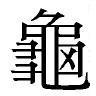 象形,甲骨文、金文、《说文》古文、小篆象龟的俯视或侧视形,隶定为“”,又作“龜”。本义读ɡuī,一种爬行动物;又读jūn,用于“龟裂”,皮肤因寒冷或干燥而裂开(也作“皲裂”);又读qiū,用于“龟兹”,汉代西域国名,在今新疆库车一带。近代俗字、《简化字表》简作“龟”,据草书楷化。