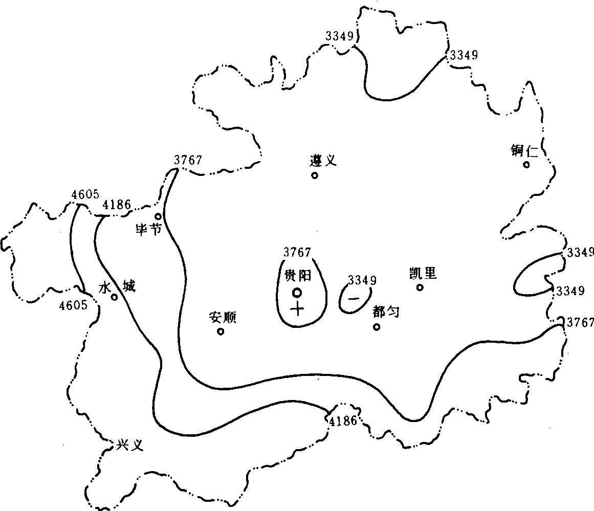 图1-1-1 贵州省年总辐射分布图(单位: 兆焦耳/米2·年) 2.光合有效辐射。据研究,光合有效辐射约占总辐射的47%—53%,一般是取其中间数字(即50%)进行计算,则贵州年光合有效辐射约在1 675—2 253兆焦耳/米2之间,其时空分布特征与年总辐射量相似。 年内≥10℃期间的光合有效辐射,全省大部分地区为1 256—1 465兆焦耳/米2。南部边缘地区和北部赤水河谷一带为1 465—1 675兆焦耳/米2。威宁虽年总辐射量为全省之冠,但因≥10℃期间日数最少,只有163天,故≥10℃的光合有效辐射为全省最少,只有1046兆焦耳/米2。