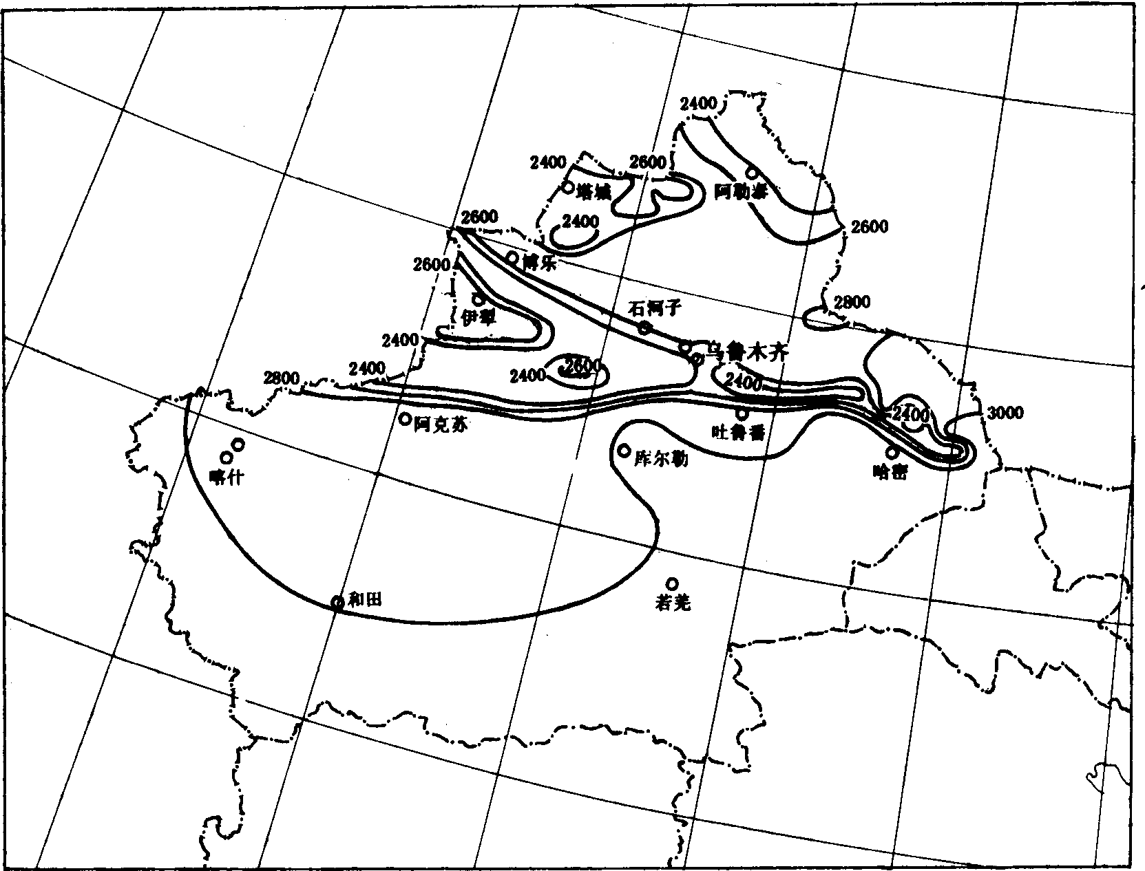 图 1-2-1 年光合有效辐射分布图 (兆焦耳/平方米) 资料来源: 徐德源著 《新疆农业气候资源及区划》。 1. 太阳总辐射。新疆空气干燥,云量较少,晴天多,光资源十分充裕。年总辐射量5 000~6 490兆焦耳/平方米,比同纬度的华北和东北地区多620~840兆焦耳/平方米,比长江流域中下游多1 250~2 090兆焦耳/平方米,居全国第二。其中,北疆5 200~5 600兆焦耳/平方米;南疆6 000~6 200兆焦耳/平方米。最小值在准噶尔盆地,约5 200兆焦耳/平方米以下。最大值在淖毛湖,达6 200兆焦耳/平方米以上。 2. 有效辐射与光合有效辐射。太阳有效辐射,北疆1 700~1 800兆焦耳/平方米,南疆2 000兆焦耳/平方米,东疆2 100~2 200兆焦耳/平方米。其分布由南向北、由东向西减少,由平原向山区减少。准噶尔盆地1 700兆焦耳/平方米,为低值区;南疆塔里木盆地2 100兆焦耳/平方米,为高值区。 光合有效辐射是太阳光谱波段380~710纳米的可见光,可被植物在光合时为叶绿素选择吸收的部分,约占总辐射的50%。南疆光合有效辐射为2 800~3 300兆焦耳/平方米,北疆为2 500~2 800兆焦耳/平方米。光合有效辐射分布均匀,对农作物单季高产、南疆复播有利。光合有效辐射分布详见图1-2-1。 3. 光时、日照。光时指太阳实照时间和可照时间长短,对一年生植物开花期起决定作用。新疆各地白昼时间,年内以6月份最长(以16日为准,下同),一般为16多个小时,阿勒泰17. 39小时,居首位;12月份最短,为10小时左右,阿勒泰9. 51小时,为最短。 新疆年日照时数呈北少南多,西少东多的分布规律。全疆一般在2 800~3 000小时,哈密地区可达3 400小时,南疆和田由于浮尘影响为2 600小时。最多日照时数为哈密地区的星星峡,年可达3 549. 4小时,居全国第2位; 5月份日照时数平均每日11. 5小时,为全国之首。 4. 光温生产潜力。作物光温生产潜力的大小,主要决定于光合有效辐射量、光能利用率和温度条件对光合作用强度的影响程度。若取光能利用率5%,最大地方光温资源丰富区,如吐鲁番、塔里木盆地、和田地区年产可达每亩1 400公斤以上; 乌鲁木齐、伊犁河谷、准噶尔盆地可达每亩1 200公斤左右;山间盆地相应减少。目前新疆粮食等作物单产还比较低,潜力大,只要采用先进的科学技术,合理灌溉、施肥,农作物单产会大大提高。粮食作物光温生产潜力分布见图1-2-2。 ☚ 二、气候资源 (二)热量资源 ☛ |