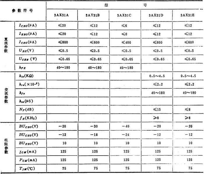 半导体三极管简称晶体管或三极管, 1.4.1 三极管的结构 三极管的结构,目前最常见的有平面型和合金型两类。硅管主要是平面型,锗管都是合金型。三极管分为NPN型和PNP型两类,当前国产硅晶体管多数为NPN型(3D系列),锗晶体管多为PNP型(3A系列),三极管的结构和符号见表8.3-5。 表8.3-5 三极管的结构和符号 a)载流子运动 b)电流分配NPN型晶体管,发射区中的多数载流子(电子)在正向电压作用下,不断通过发射结扩散到基区,形成发射极电流IE,其方向与电子运动方向相反。由于基区很薄,到达基区的电子绝大多数很容易穿过基区而到达集电结,被集电区收集,构成集电极电流Ic,只有很少部分电子与基区的空穴复合形成基极电流IB.当IB增大或减小时,Ic也按一定比例增大或减小.可见,IB的微小变化,即可引起Ic有较大的变化,这就是三极管的电流放大作用。实质上,三极管的电流放大作用就是三极管的电流控制作用或电流分配作用。 PNP型三极管的电流放大原理与NPN型三极管相同,只是电压的极性和电流方向与NPN型三极管相反。 三极管有截止、放大、饱和三种工作状态。当三极管发射结和集电结的偏置电压的极性不同时,三极管的工作状态将发生变化。其中放大状态起放大作用,截止和饱和状态起开关作用。三极管三种工作状态的特点见表8.3-6。 表8.3-6 三极管三种工作状态的特点 a)输入特性曲线 b)输出特性曲线 半导体三极管主要参数的名称、符号和意义如表8.3-7。几种常用半导体三极管的型号和参数见表8。3-8和8.3-9。 表8.3-7 三极管主要参数的名称、符号和意义  注:本章采用下述符号规则:大写字母大写下标代表静态量,小写字母小写下标代表微变量,大写字母小写下标代表交流微变量的有效值,小写字母大写下标代表交直流总量。 表8.3-9 3AX31型PNP锗合金低频小功率三极管  |