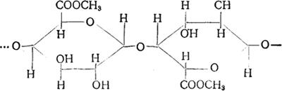 (2)半纤维素 介于淀粉与纤维素间的各种多缩戊糖和多缩己糖的混合物,为甜菜肉的23%。主要成分是多缩戊糖(树胶糖)。不溶于水,溶于碱。与1%的稀酸共热则水解为树胶糖、木糖、甘露糖、半乳糖和多缩糖醛酸(葡萄糖醛酸及半乳糖醛酸)的甲酯。受酶作用部分水解。受碱作用部分溶解,造成糖汁中胶体物和色素的增加。 2.果胶质 约占固形物的2.5%,为甜菜肉中最多的非糖分。果胶质是一种混合物。在甜菜肉中不溶于水的果胶称为原果胶质,可溶性的果胶质称果胶,即部分或全部酯化的多缩水解乳糖醛酸(约含7%的-O-CH3基)。 果胶(部分酯化的多缩水解乳糖醛酸)的结构式为: