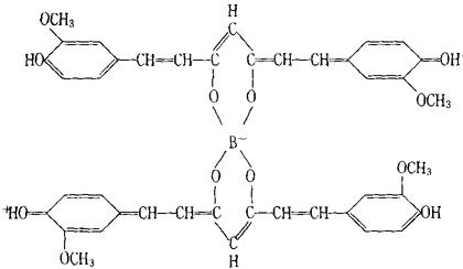| 释义 | 姜黄素比色法 利用硼与姜黄素作用生成玫瑰红色的玫瑰花青苷的反应测定硼的一种比色方法。 姜黄素又称姜黄或郁金黄(curcumine)其化学式C21H20O6,以酮型和烯醇型存在。在酸性介质中姜黄素与硼结合成玫瑰红色的络合物,即玫瑰花青苷(rosocyanim),它是两个姜黄素分子和一个硼原子络合而成:该络合物检出硼的灵敏度是所有比色测定硼的方法中最高的(摩尔吸收系数ε550=1.80×105),最大吸收峰在550nm处,溶液在0.0014~0.06mg/kgB的浓度范围内符合Beer定律。 在比色测定B时,应严格控制显色条件,以保证络合物的形成。该络合物溶于酒精后,在室温下1~2h内稳定。