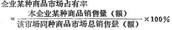 | 释义 | 市场占有率 在一定时间内,企业某种商品销售量(额)占该市场范围内同种商品总销售量(额)的百分率,其计算公式为: