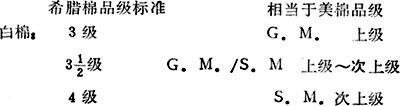 希腊棉花的白棉分5个全级和4个半级。另有淡点污棉4个级(4~7级)。希腊棉的品级标准亦与美国棉花品级标准有一定的对等关系: