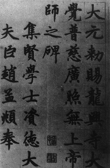 | 释义 | 帝师胆巴碑 【简介】: 元·赵孟頫元延祐三年(1316)书。纸本。楷书。33.6×166cm。《东图玄览》、《淸河秘箧表》、《南阳名画表》、《式古堂书画汇考》、《三虞堂书画目》、《壬寅消夏录》等书著录。故宫博物院藏。刊于《故宫藏历代法书选》(三)、日本《中国书道全集》(六)。