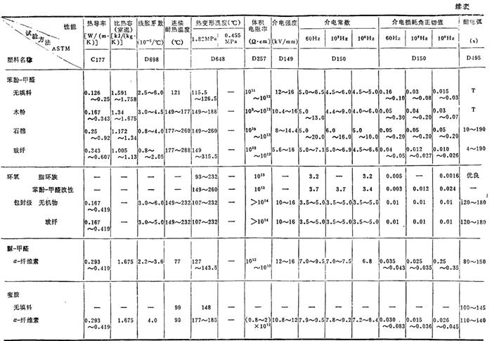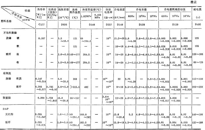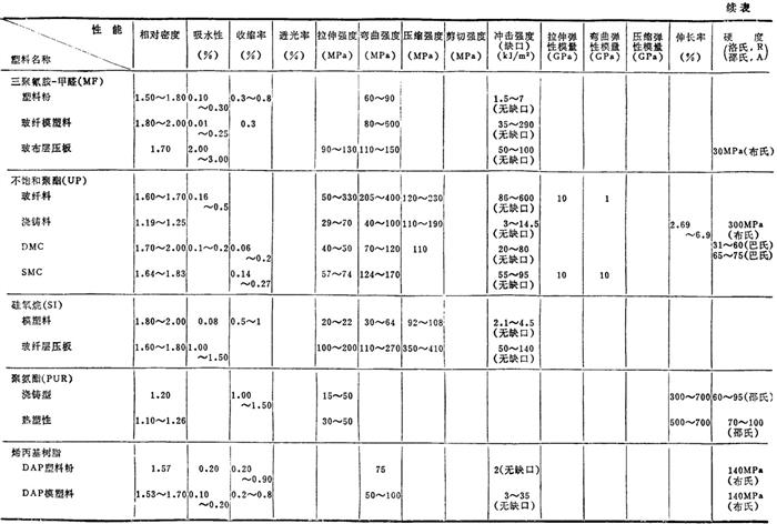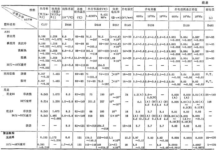 注: ❷ (A)为干燥料成型(含水量0.2%),(B)为相对湿度50%下调质处理过。 ❸ 表中数据均为由英制换算得到。 ❹ 各性能的含义见表2.2-9。 表2.2-5 常用塑料的物理(热、电)性能