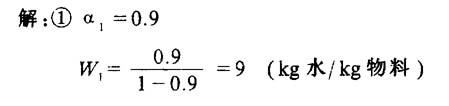 式中 W1、W2——干燥前后每kg干燥物料的含水率(kg水/kg物料) W——总蒸发量(kg/kg物料) G——物料总重量(kg/kg物料) G0——绝干物料重量(kg/kg物料) α1、α2——干燥前后每kg湿润物料的水分(%) [例]假设物料的初始水分α1=0.9,则: ❶ 干燥1kg物料需除去多少水分; ❷ 若要把初始水分α1=0.85,初始含水率ω1=5.67的物料干燥到绝干程度,则干燥1kg物料少除去多少水分?少蒸发多少kg水?对初始水分来说,可以节省多少干燥量。  即干燥1kg物料就需除去9kg水分。 ❷ 干燥lkg物料则少除去的水分为: α1-α2=0.9-0.85=0.5 少蒸发水分为: W1-W2=9-5.67=3.33(kg水/kg物料) 对初始水分来说,可节省干燥量:  |