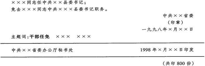| 释义 | 干部任免通知 【简介】: 干部任免通知的定义和特点 干部任免通知是组织部门常用的一种公文,其主要作用是传达上级党委对人事变动的决定,反映干部职务升、降,岗位更换的情况。它具有以下特点:一是严肃性。干部任免通知不仅是重要记载、记录,而且是命令,上级党委的决定一旦下达,受命者就必须服从,因此,任免通知要写得庄重、简洁明了,并能迅速、完整地反映上级党委的意图。二是准确性。干部任免通知,表达要十分准确,文中所涉及的时间、地点、名字排列、职务称谓等都不能有丝毫误差,甚至在用“字”上都要精心考究,比如,“副职”只能用“副”字,而不能用“付”字。干部的名字一定要用规范字,不能随意简化或用同音同义字代替,三是法规性。干部任免通知,要严格按照干部管理权限上报下发,不能越级越权。凡是依法由各级人民代表大会选举产生或由人大常委会决定任命以及由各级人民政府任命的领导职务,必须遵照有关法律规定,严格按程序办理。 干部任免通知的格式 干部任免通知的格式和其它通知的格式基本相同,但要注意以下几点:1.标题。一文中涉及二人职务的,标题要用“关于×××、×××同志的任职通知,”如果其中有免职的,标题即要用“关于×××、×××同志的职务任免的通知”;一文中涉及两人以上职务的,标题要用“关于×××等同志……”。2.正文。属上级党委直接下发任免通知的,用“党委决定:×××同志任××职务”;属下一级党委呈报,由上级组织部门讨论,代党委下发任免通知的,用“经研究同意:×××同志任××职务”;属人民代表大会选举的候选人,用“党委推荐:×××等同志为候选人”;属人大常委会或人民政府任命的干部,用“党委提名:×××等同志任××职务”。3.抄送机关。要考虑与本任免通知相关的单位和个人,不要扩大抄送范围,一般来说,党委常委、纪委、政府、人大、政协、组织人事等部门都要抄送。除干部任免通知外,有关干部任免的文件还有批复、函等。 【范例】: 中国共产党××省委员会(通知) ××字[1993]××号 关于×××、×××同志职务任免的通知 各地、市、县委,省委各部门,省直各单位党组(党委): 省委决定: