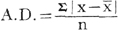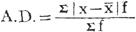公式中:A.D.代表平均差,x代表各标志值, 平均差与总体的每个标志值大小都有关,它比全距、四分位差等指标更能综合地反映总体各单位的变异程度。平均差愈大,标志变动度愈大,反之,愈小。但标志值对算术平均数的离差有正有负,正离差之和正好等于负离差之和,如按代数法相加,则总离差将为零。舍弃正负号相加,不适合于代数方法的处理。这是平均差指标的一个缺点。 平均差要和算术平均数结合使用。它以算术平均数为中心,可以表现为: 在正态分布情况下,落入 |